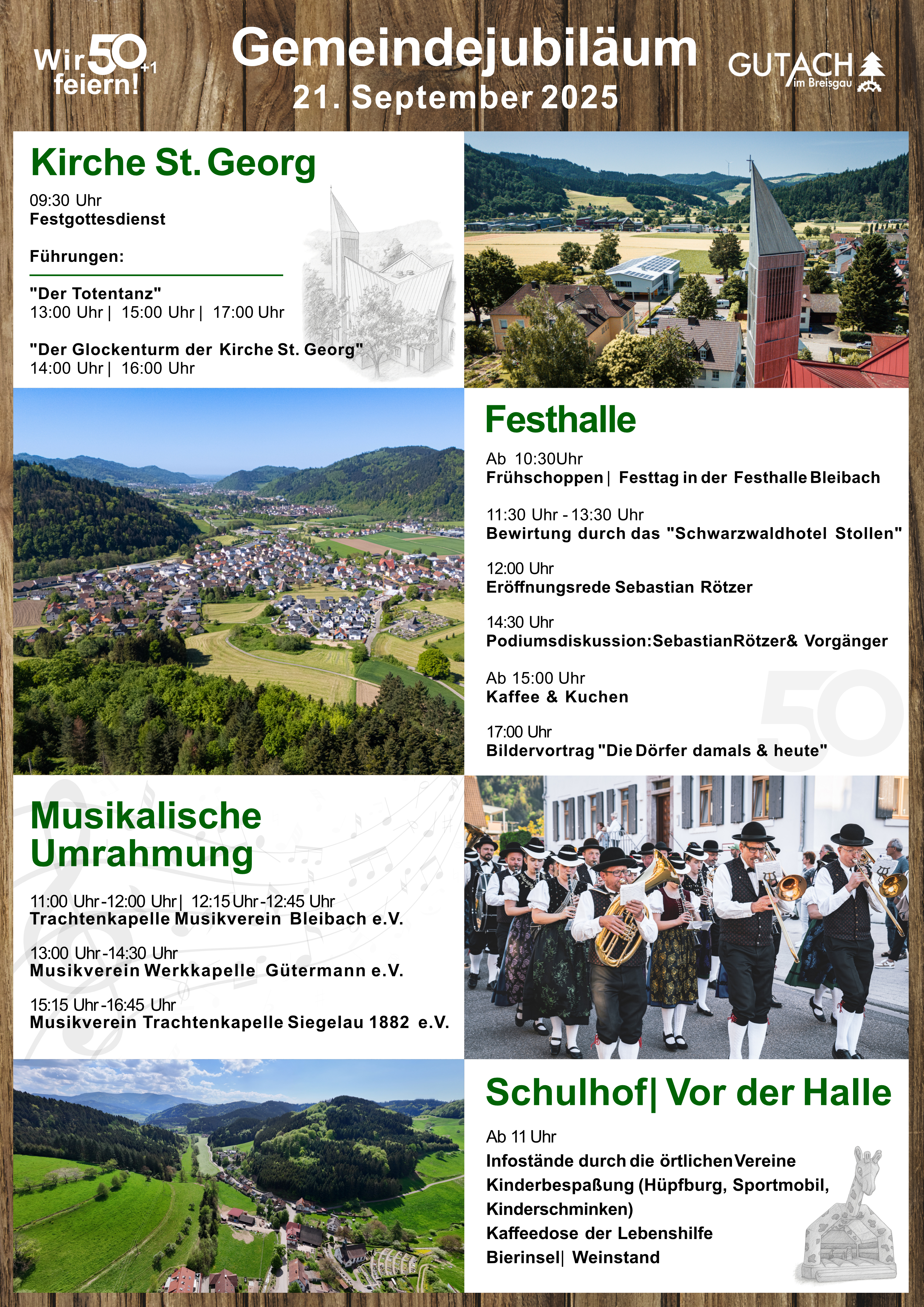 Nach einem Festgottesdienst um 9:30 Uhr in der Kirche St. Georg in Bleibach laden die Gemeinde und örtlichen Vereine in die Festhalle zu Frühschoppen, Mittagstisch, Kaffee und Kuchen.