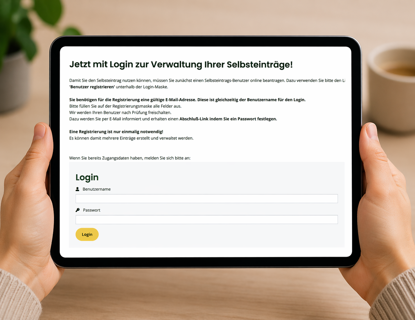 Damit Sie den Selbsteintrag nutzen können, müssen Sie zunächst einmalig einen Selbsteintrags-Benutzer online beantragen.